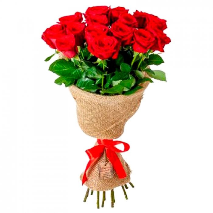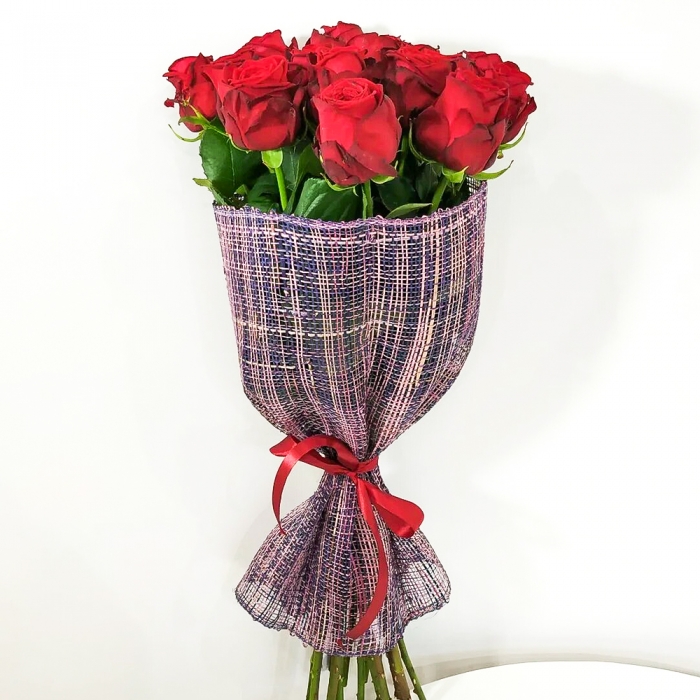 Букет из 15 ярко-красных роз оформленные в сетке.