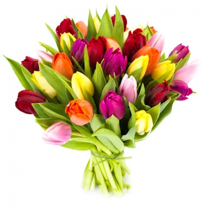 Букет из 25 разноцветных тюльпанов в классическом оформлении + наш фирменный подарок!