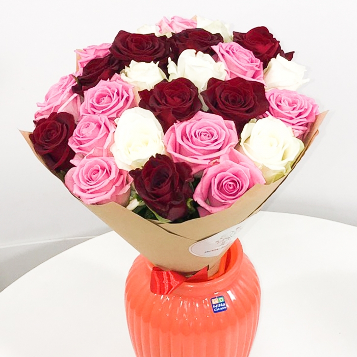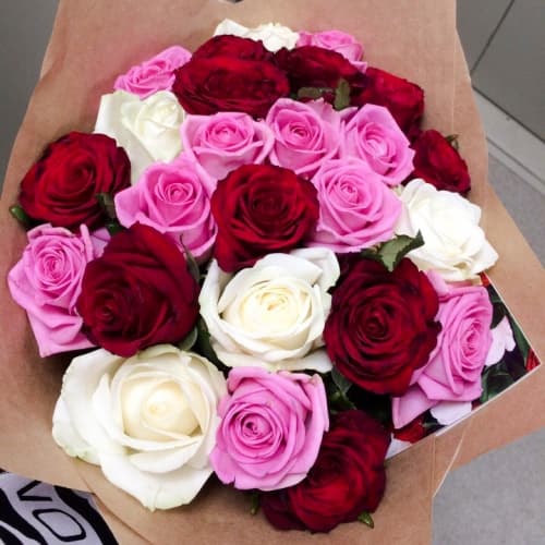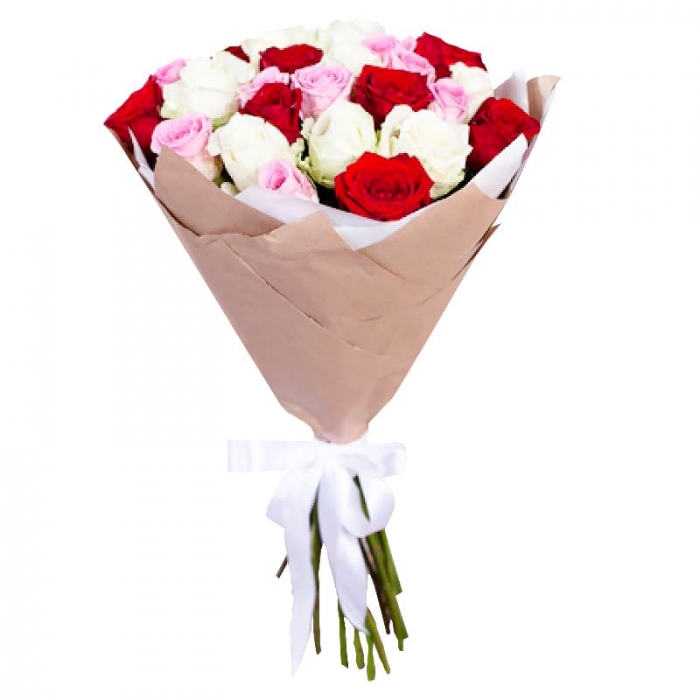 Специальное предложение этого сезона по супер-цене! 25 роз разного цвета (белые, красные и розовые) в оригинальной краф-упаковке с фирменными бонусами в подарок!