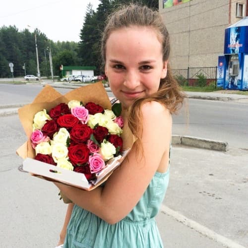 Categories: 8 марта, Букеты, Букеты из 25 роз, Букеты из роз, Крафт-букеты, Крафт-букеты, Любимой девушке, Разноцветные розы, Розы, Розы на 8 марта