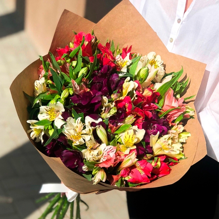 Букет состоит из 15 веточек разноцветной альстромерии. Оформление крафт-бумага