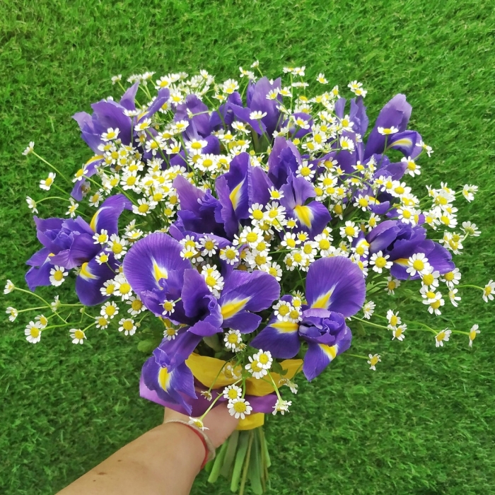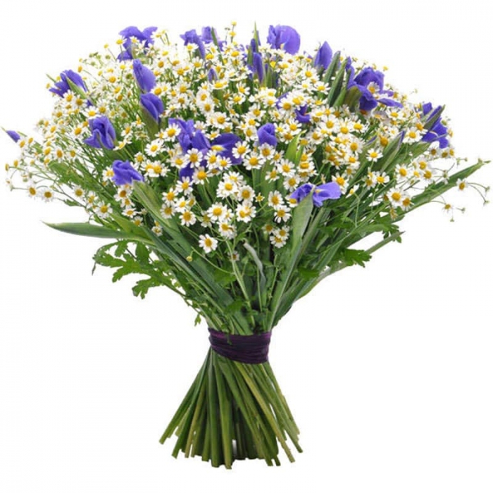 Неожиданное сочетание цветов представлено в букете Дуэт. Состав букета: 11 ирисов, 10 веточек ромашки сорта Камилла.