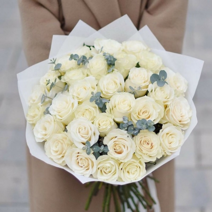 Букет из 31 белой розы и эвкалипта