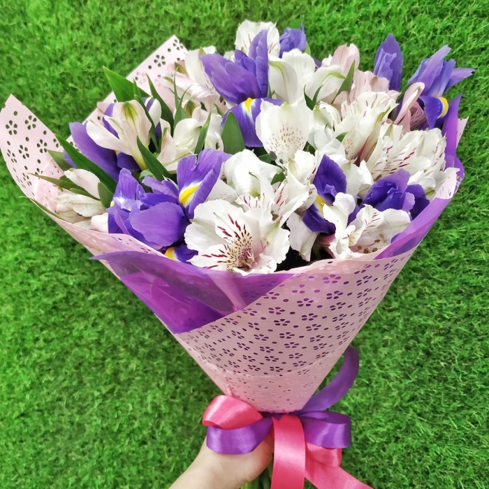 Нежный букет из 4 веточек альстромерии (цвет может отличаться) и 7 ирисов.