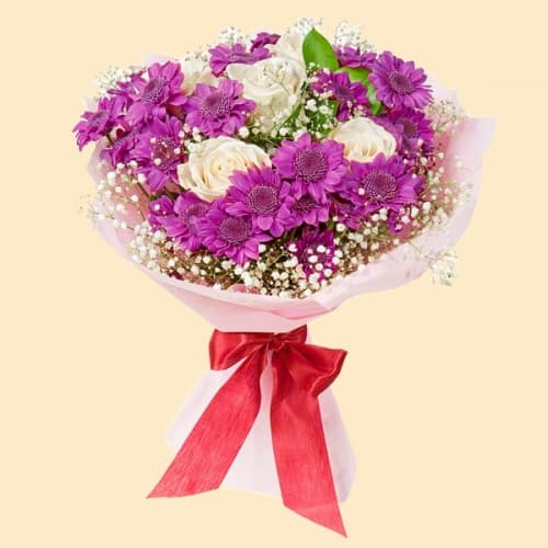 Букет из 7 белых роз 50 см, 3 фиолетовых хризантем, 3 веточек гипсофилы, зелени в оформлении из белого фетра с яркой лентой.