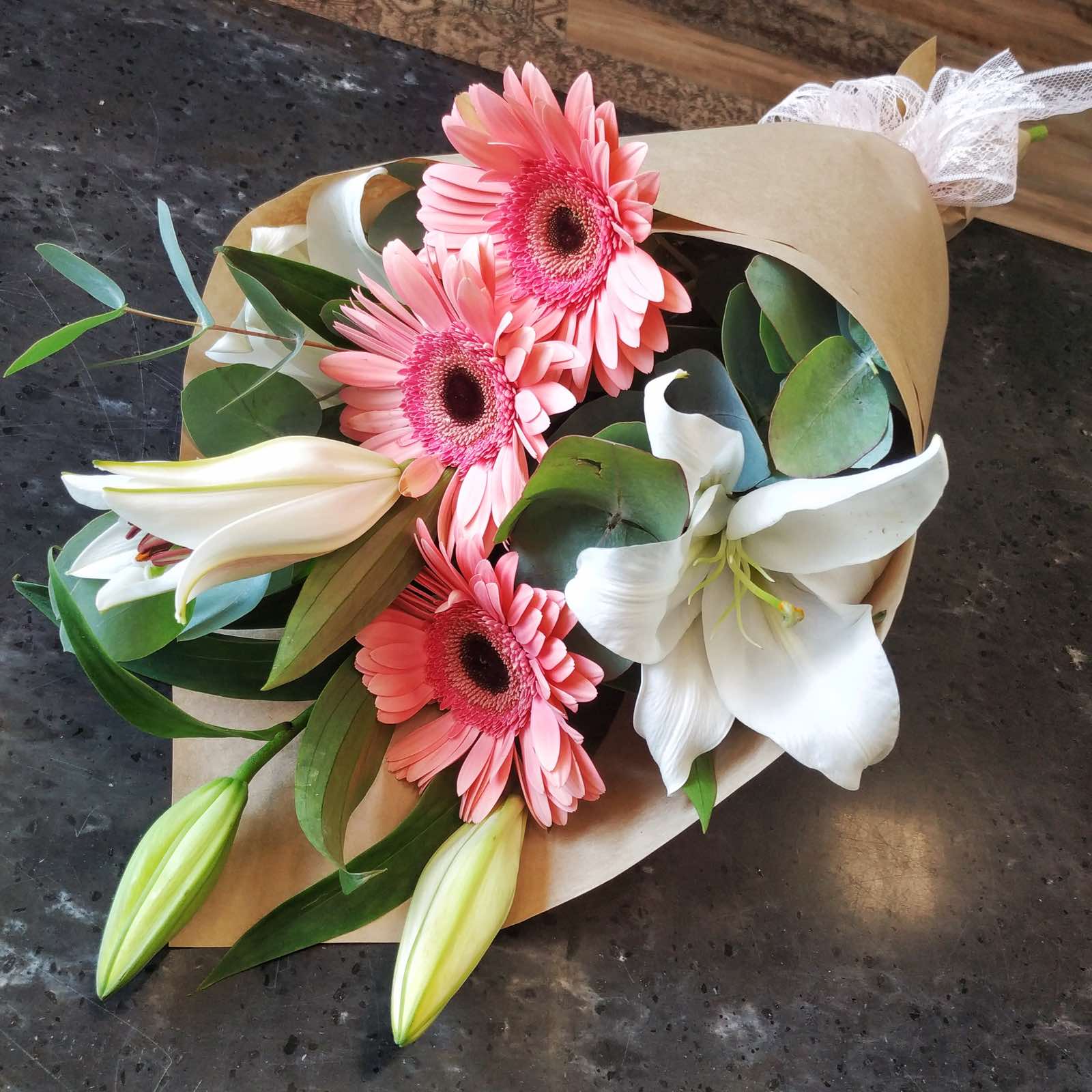 Милый и необычный букет из гербер ( цвет гербер может отличаться от предоставленного) и веточки белоснежной лилии.