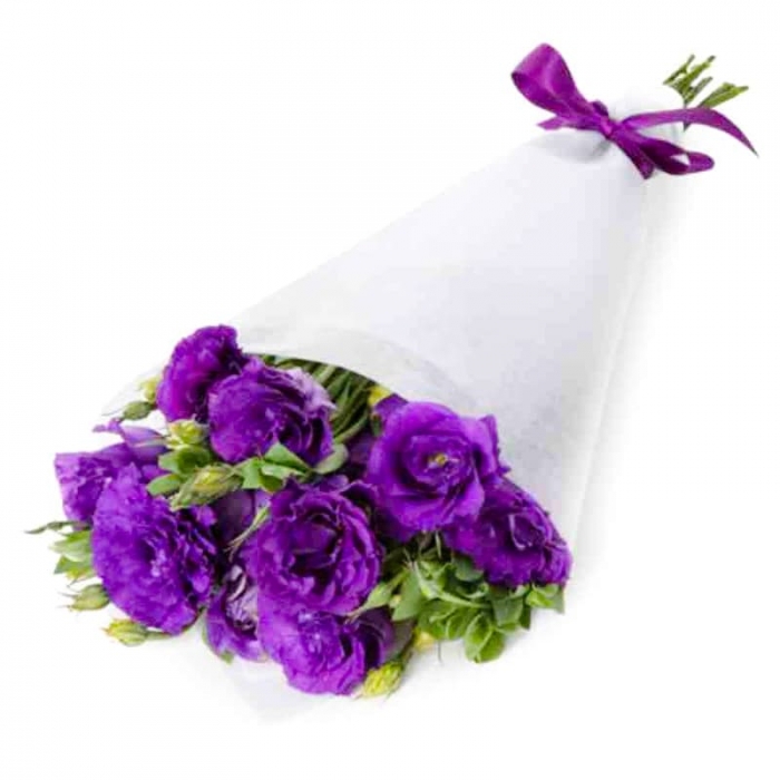 Букет оформляется из фиолетовых или с фиолетовой окантовкой эустом.