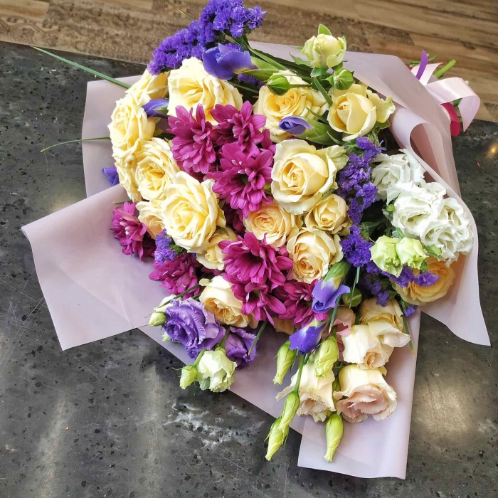 Нежный и элегантный букет из 3 веточек хризантем, 5 веточек кустовых роз,  4 эустом,  7 ирисов, и статицы.