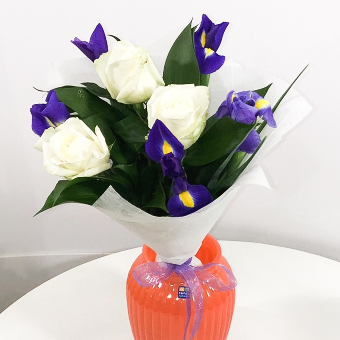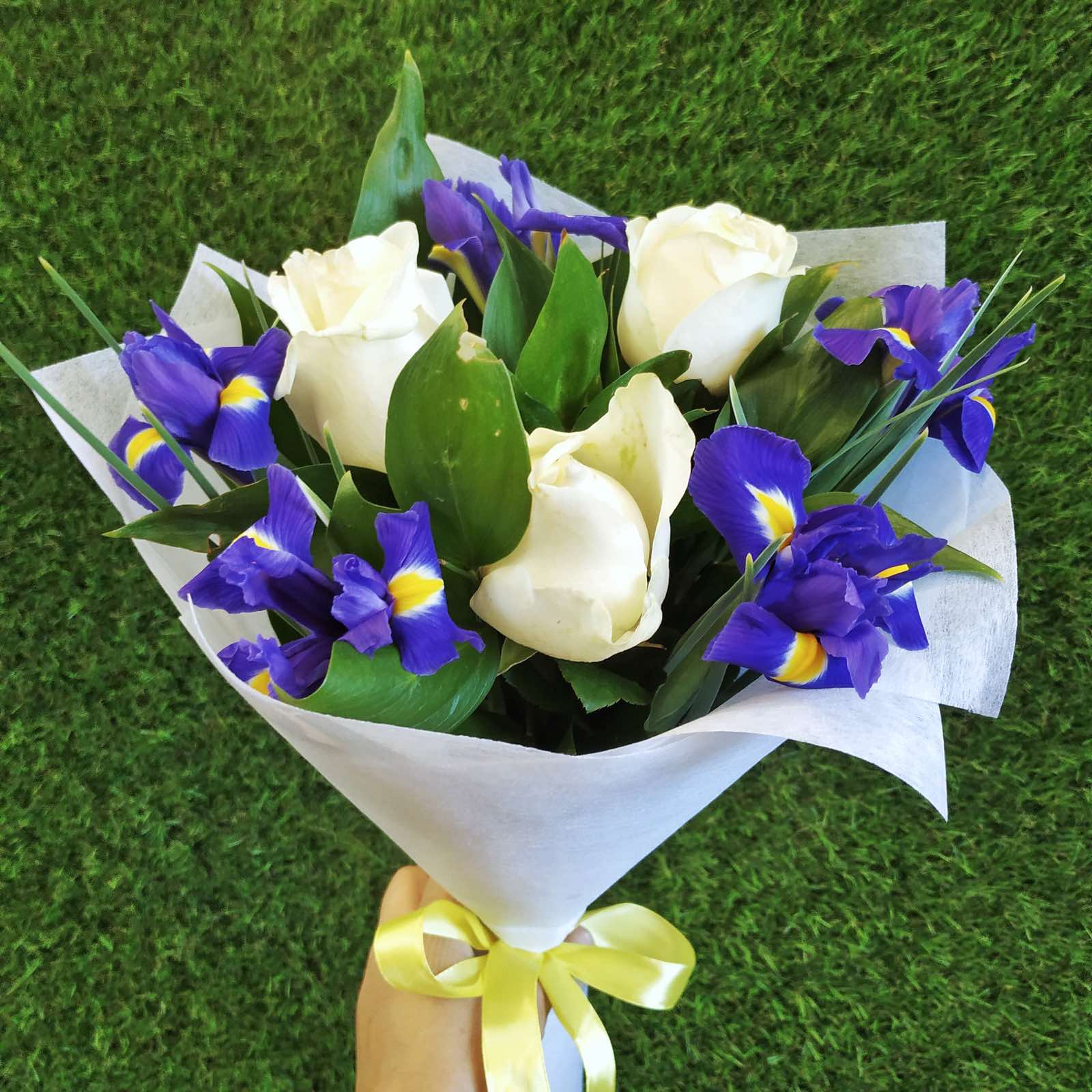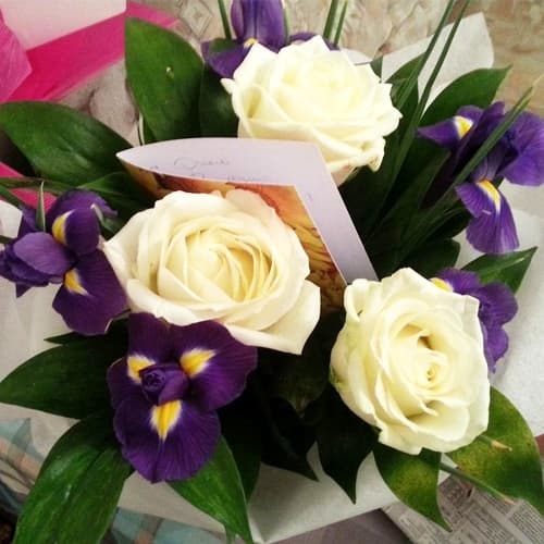 Хороший и приятный небольшой букет из 3 белых роз 50 см и 5 ирисов с зеленью в оформлении.