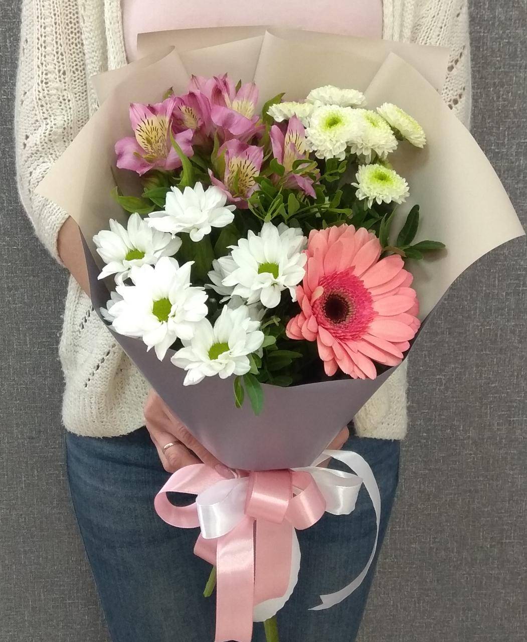 Небольшой, но милый букет из герберы, 2 кустовых хризантем, альстромерии и зелени.