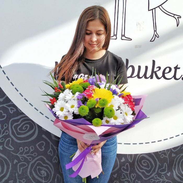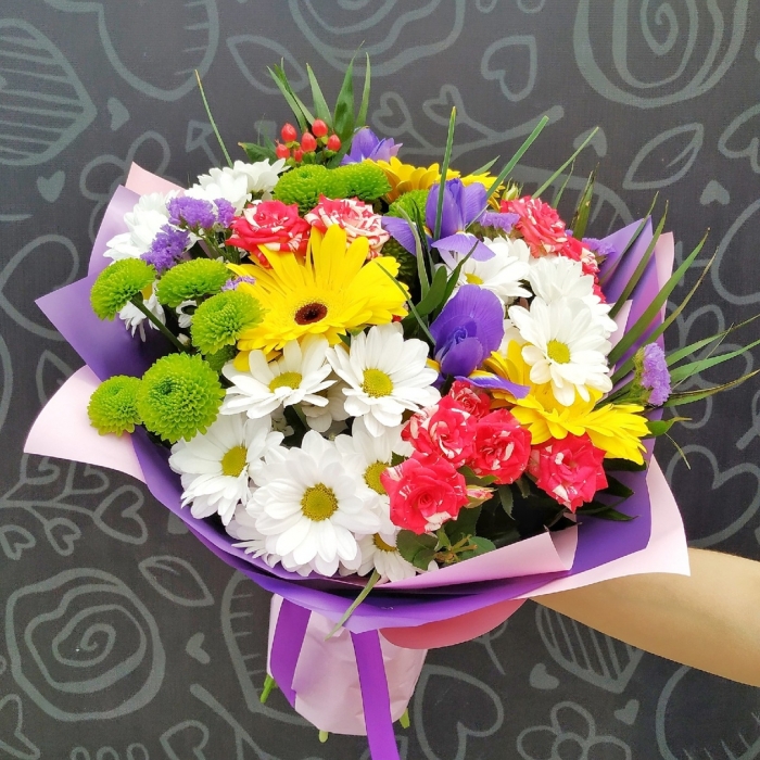 | Состав букета | Гербера, Ирис, Кустовая роза, Хризантема |