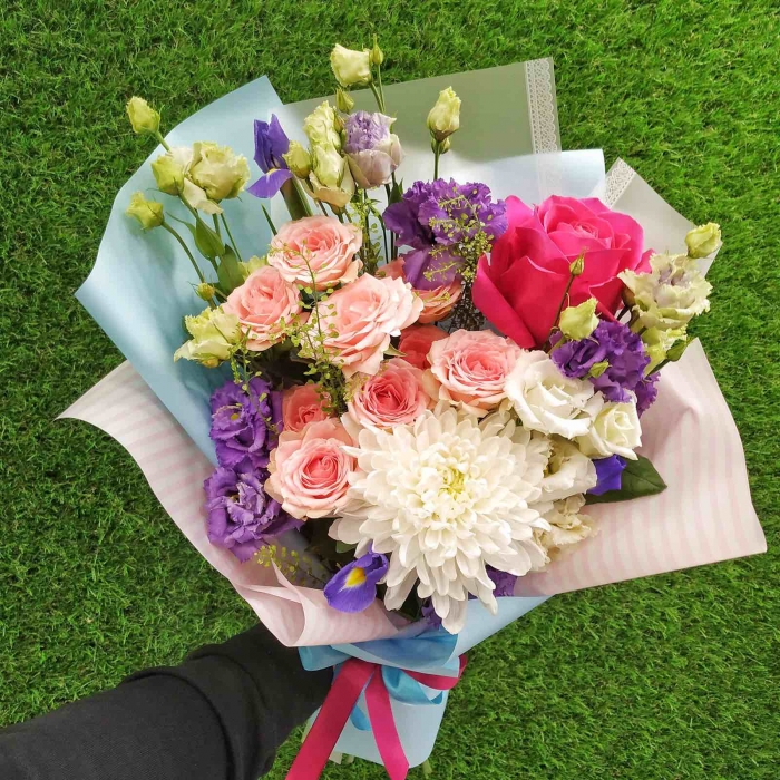 | Состав букета | Ирис, Кустовая роза, Роза, Хризантема, Эустома |