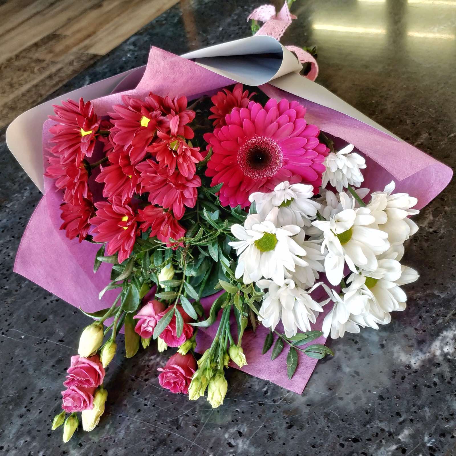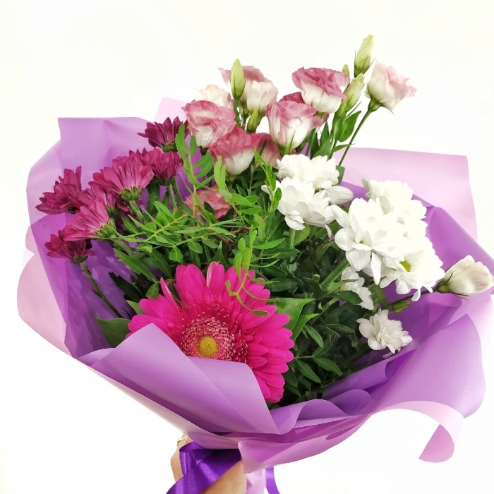 Букет состоит из 2х веточек белой и розовой кустовой хризантемы, 1 розового гербера, 2х веточек розовой эустомы, зелени