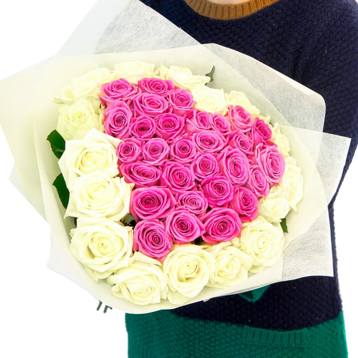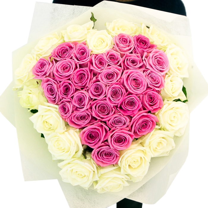 Букет Сердечко состоит из 45 розовых и белых роз длиной 50 см