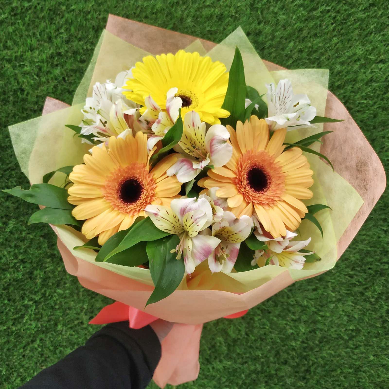 Яркий и одновременно нежный букет из 3 гербер и 4 альстромерии.