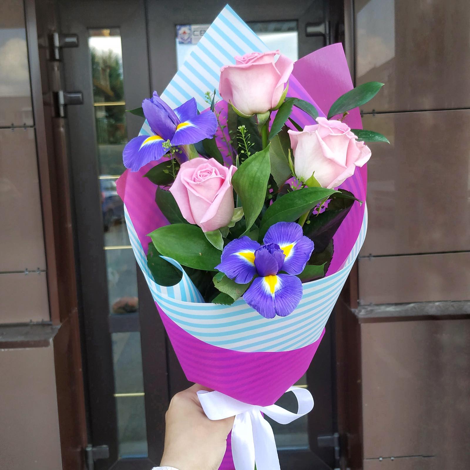 Состав: 3 розовые розы, 2 ириса и зелень в оформлении.