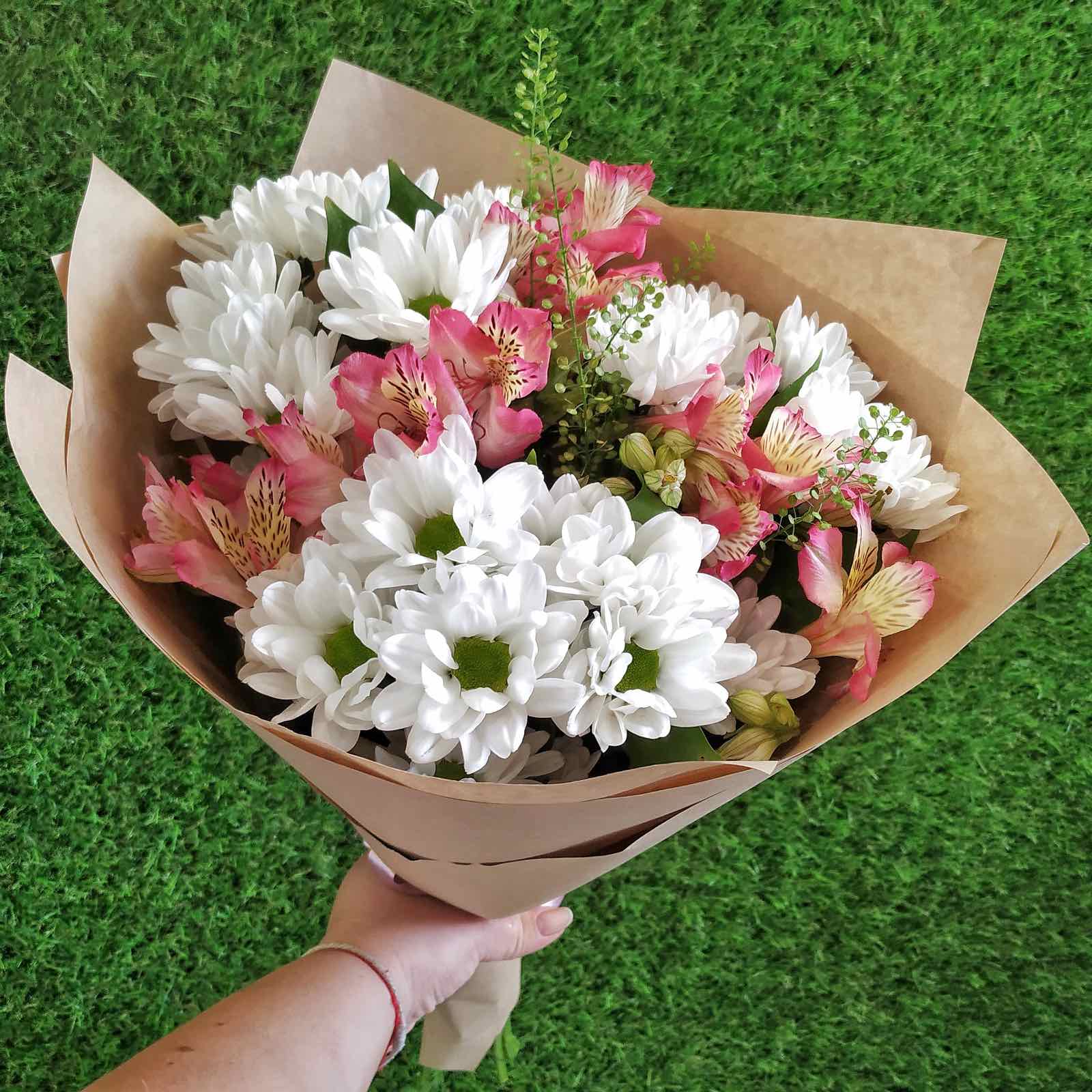 Categories: Альстромерии, Букеты, Букеты из ромашек, Крафт-букеты, Недорогие букеты, Недорогие букеты цветов, Татьянин День, Хризантемы, Цветы