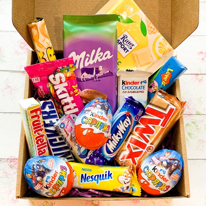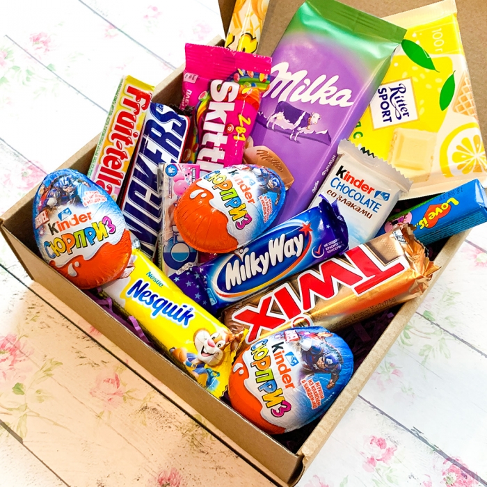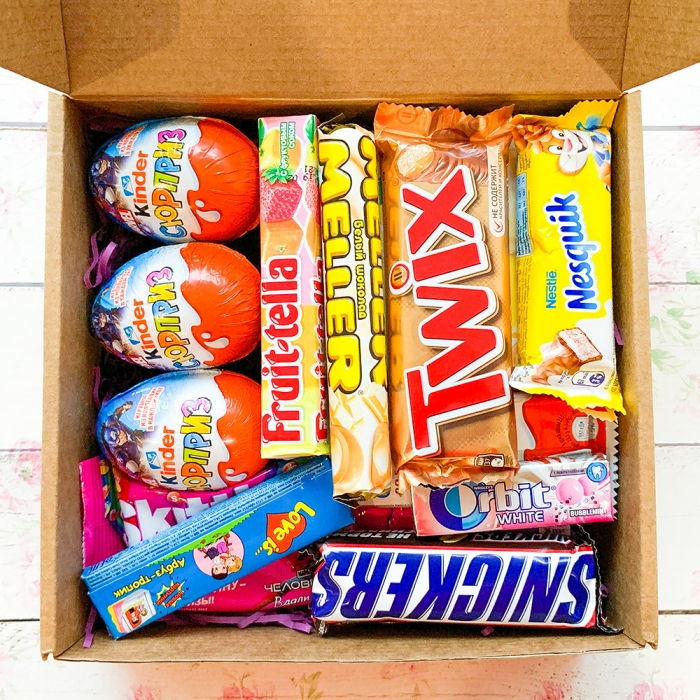 Состав: Шоколад Милка, Риттер спорт, Батончики Твикс, Сникерс, Милкувей, Несквик, плитка шоколада Киндер, 3 киндер сюрприза, Меллер, Фрутелла, Скиттелс, пачка жевательных резинок Love is, пачка жевательных резинок Орбит