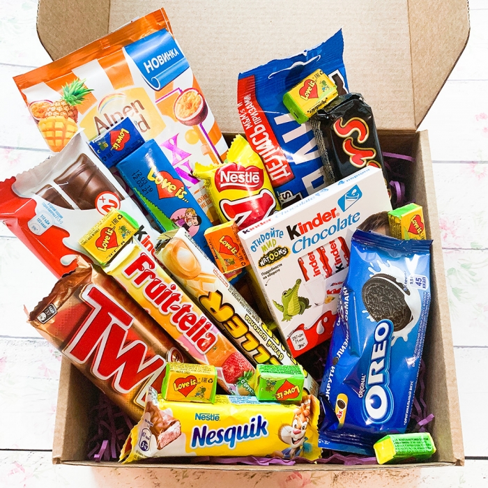 Состав: Альпен гольд МахФан, Киндер Буена, Твикс, Натс, Марс, Несквик, Фрутелла, Меллер, Орео, M&M, пачка Киндер палочки, пачка жевательных резинок Love is и поштучные Love is.