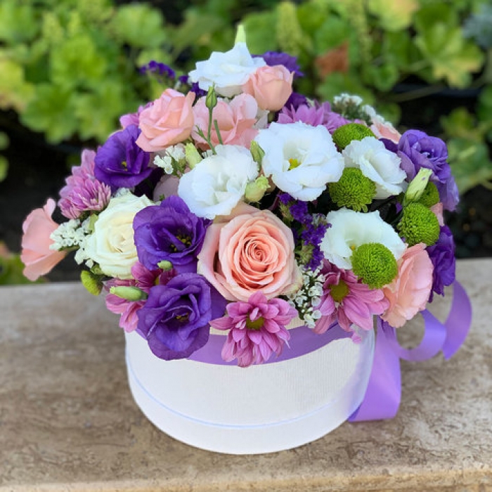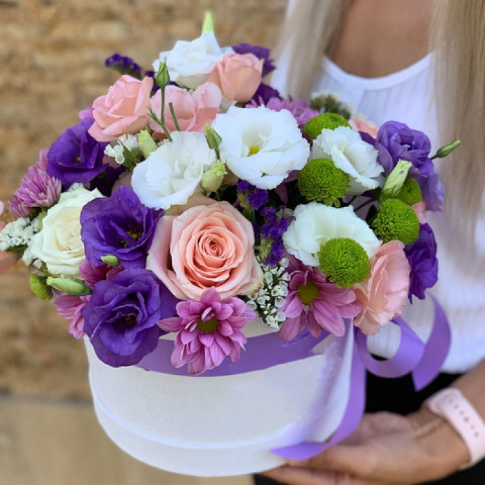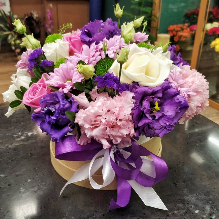 Состав композиции: 3 розовые и 2 белые розы, зеленая и сиреневая кустовая хризантема, статица, 3 веточки разноцветной эустомы