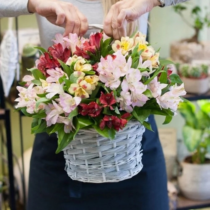 Корзинка из 19 разноцветных альстромерии в оформлении с рускусом.