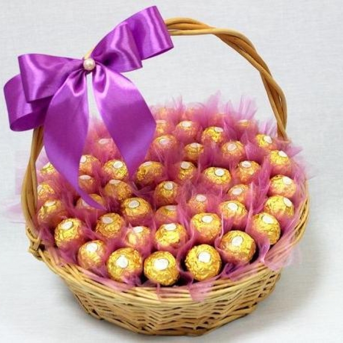 Сладкая корзина из конфеток Ферерро Роше в колличестве 50 шт, украшенная прекрасным фиолетовым бантом