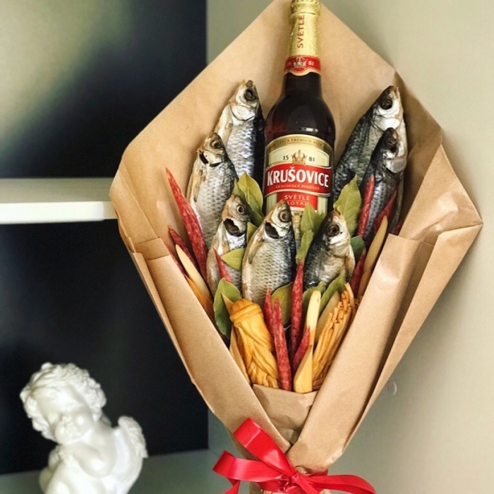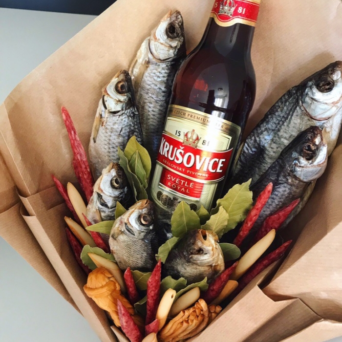 Состав: вяленая рыба, пиво, колбаски копченые, сыр косичка, лавровый лист.