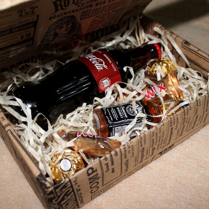 состав: 1 бутылка колы, 1 маленькая бутылочка виски, несколько конфет