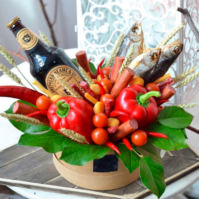 Состав: Бутылка пива, рыба сушенная, сырные шарики, разные виды колбас, сырные палочки, красный болгарский перец, помидоры черри, перец чили, колосья, салал