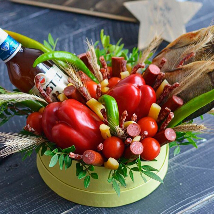 Состав: Бутылка пива, рыба сушенная, сырные палочки, разные виды колбас, болгарский перец, помидоры Черри, колосья, салал