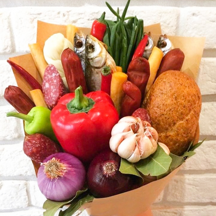 Состав: Перец, колбаски, хлеб, лук, чеснок, пучок лука, рыба, сырные палочки, сыр косичка 🙂