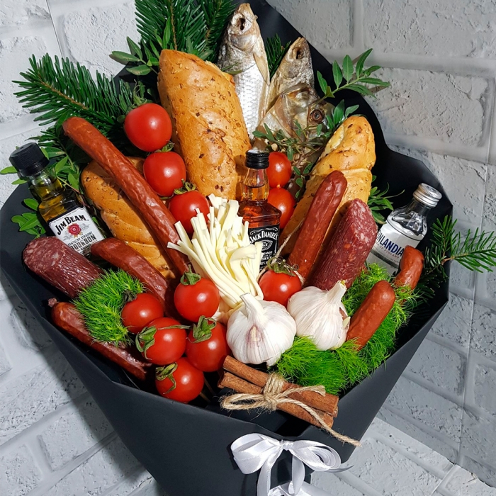 Состав: 3 мини-бутылочки коньяка, водки, виски, сушенная рыба, чеснок, помидоры черри, сыр косичкой, колбаски охотничьи, батон, зелень, палочки корицы