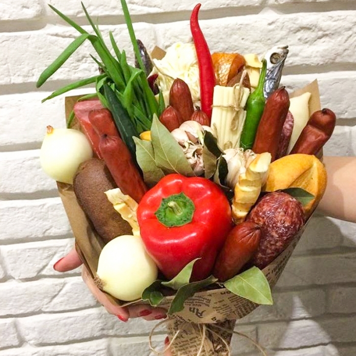 Необычный букет, оформленный в крафт бумагу из овощей, мясных изделий и зелени